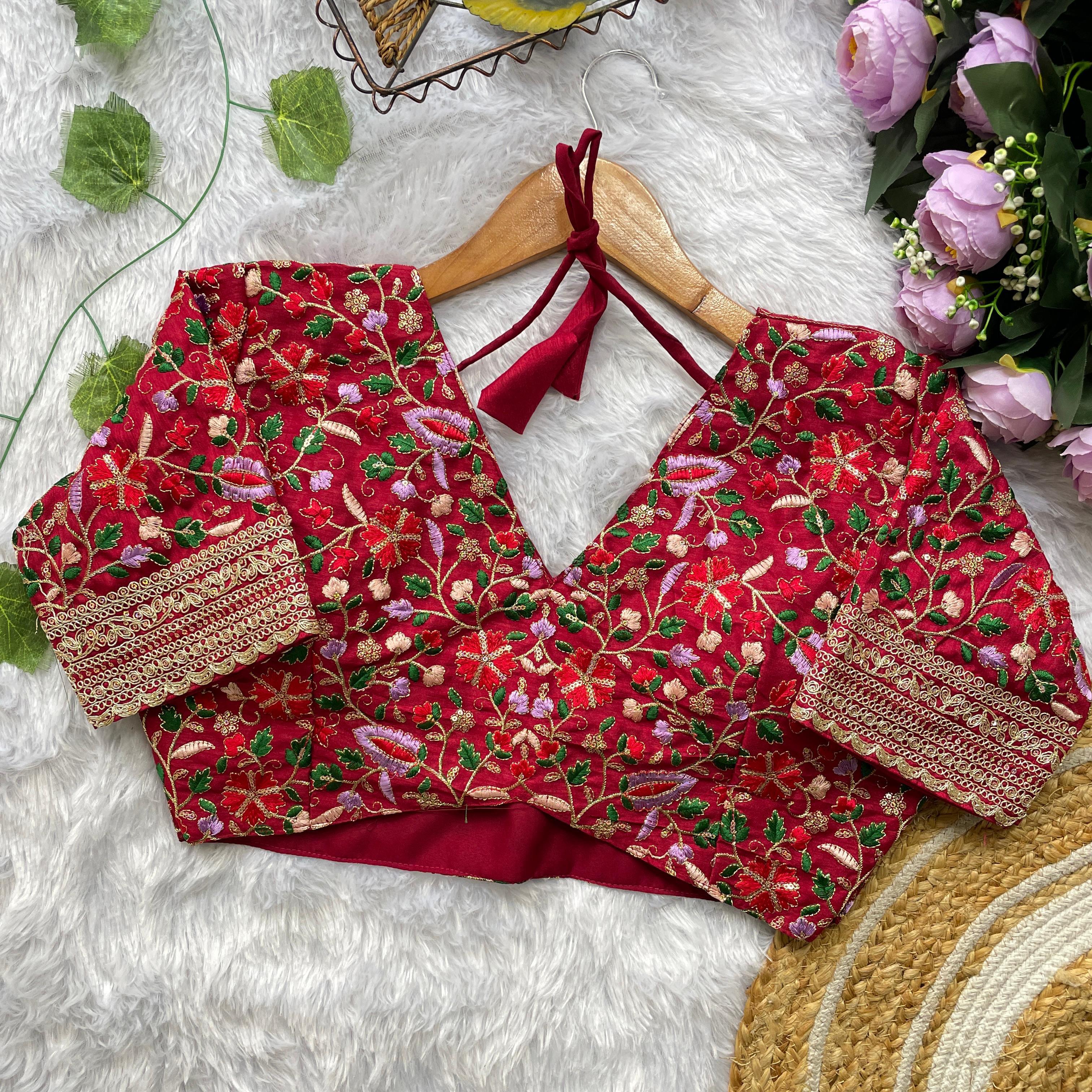 Workmanship: A masterpiece of heavy Resham (silk thread) embroidery. It features a lush multi-color floral vine pattern in shades of pink, lavender, green, and gold.